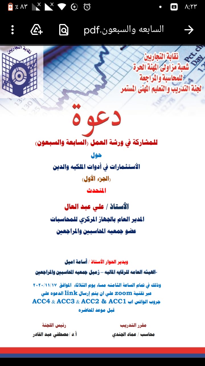 دعوة للمشاركة في الندوة الحوارية الخاصة بالاطار المحاسبي لانقضاء وتصفية الشركات وذلك يوم الاثنين الموافق ٢٠٢٠/١١/٣٠م الساعة السابعة مساءا بتوقيت القاهرة
