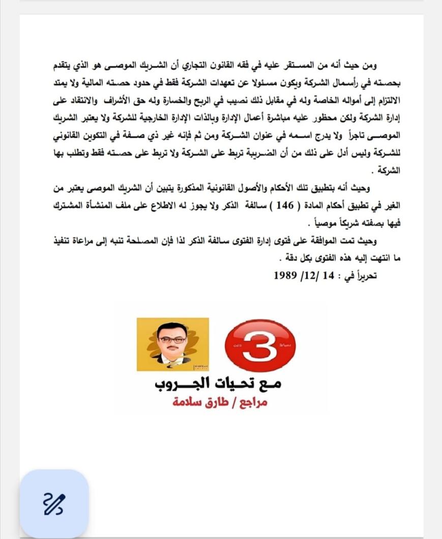 ٨ - تعليمات تفسيرية رقم ٢ لسنة ١٩٨٩م. الصادر بتاريخ ١٤ / ١٢ / ١٩٨٩م. للمادة ١٤٦ من القانون رقم ١٥٧ لسنة ١٩٨١م. في شان عدم احقية الشريك الموصي في الاطلاع علي ملف المنشأة بصفتة شريكا موصيا بها..