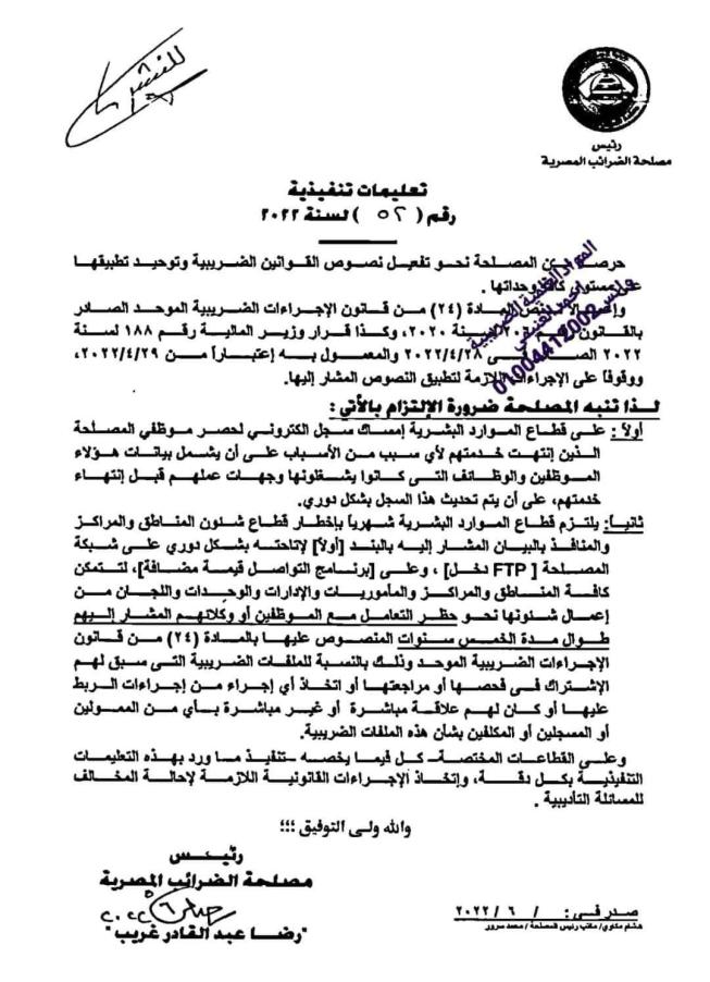 كتاب صادر بتاريخ اليوم ٣٠ / ٧ / ٢٠٢٣م. بشأن حظر التعامل مع العاملين اللذين انتهت خدمتهم بالمصلحه مع الموظفيم او وكلائهم طوال مده خمس سنوات طبقا لنص الماده ٢٤ من قانون الإجراءات الضريبية رقم ٢٠٦ لسنه ٢٠٢٠ م.